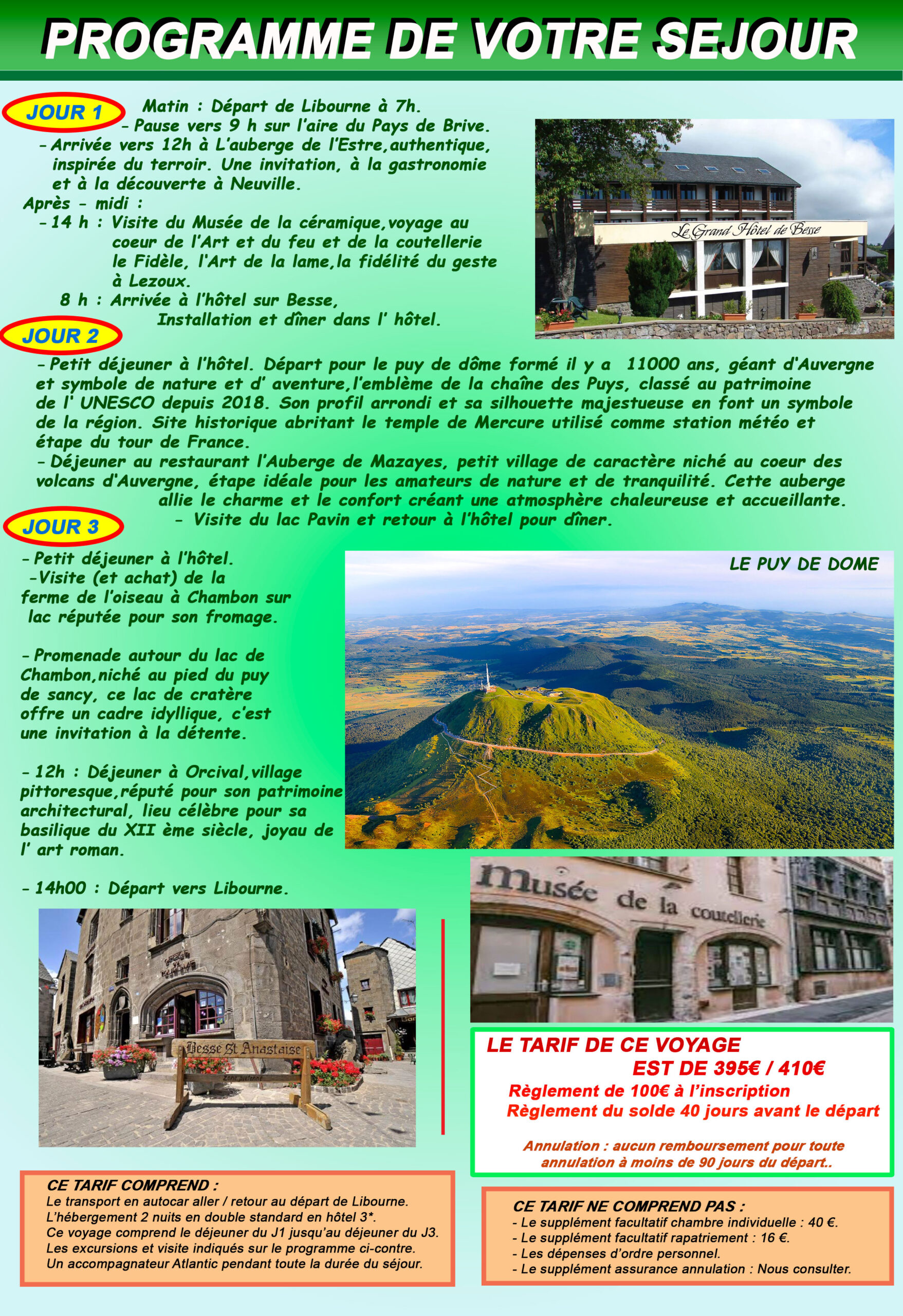 385€/400€ avec excusions tous les jours. Départ : 5h30. Règlement 100€ à l’inscription. Hôtel 4*