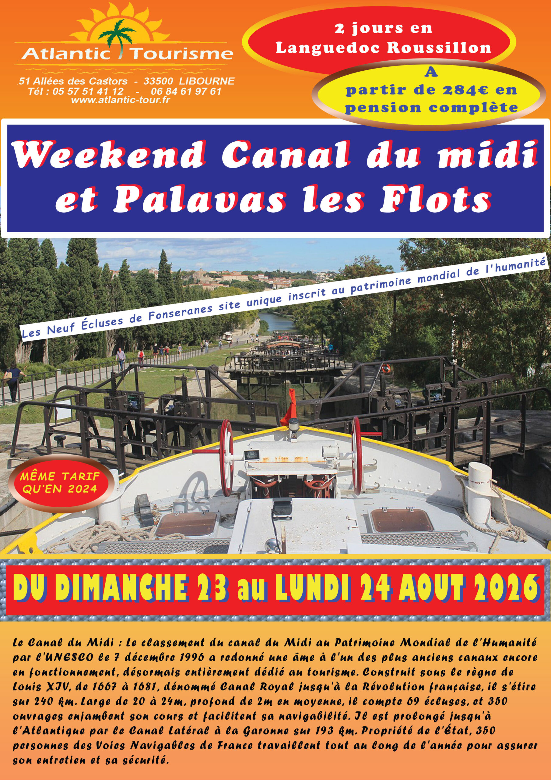 73€/75€. Départ : 7h45. Petit déjeuner gascon à la ferme de Lafite. Passage d’écluses avec la gabarre