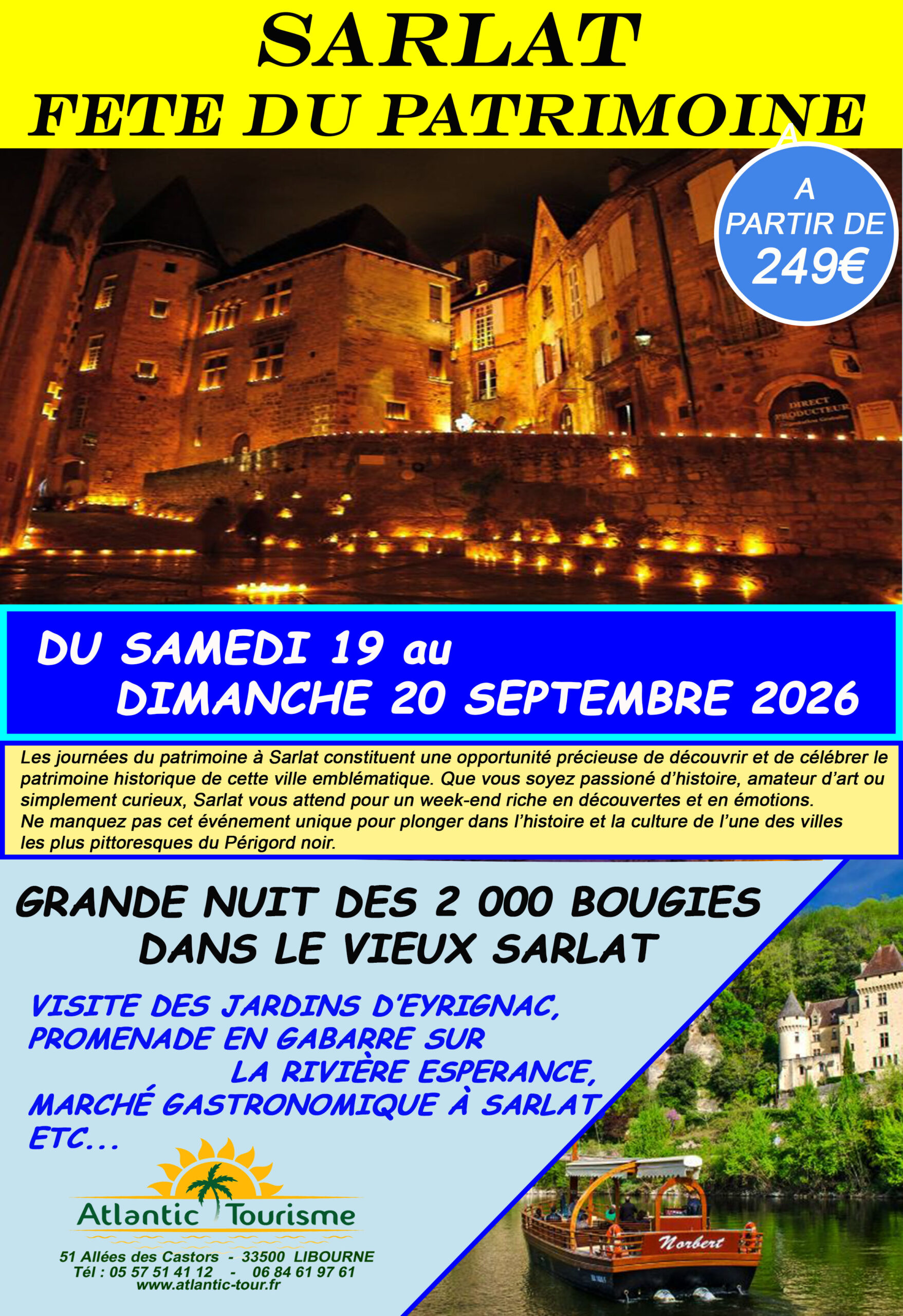 249€/264€. Départ :8h. Règlement 100€ à l’inscription. Grande nuit des 10 000 BOUGIES dans le vieux Sarlat