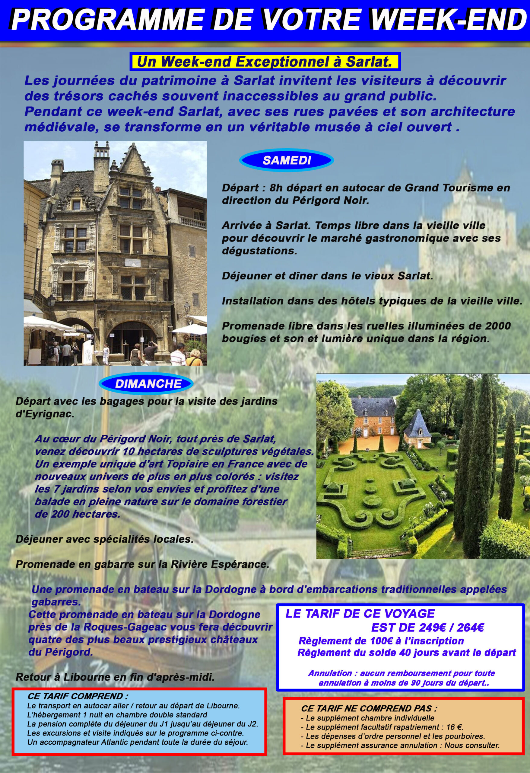 Visite des jardins d’Eyrignac, Promenade en gabarre sur la rivière Esperance, marché gastronomique à Sarlat, etc