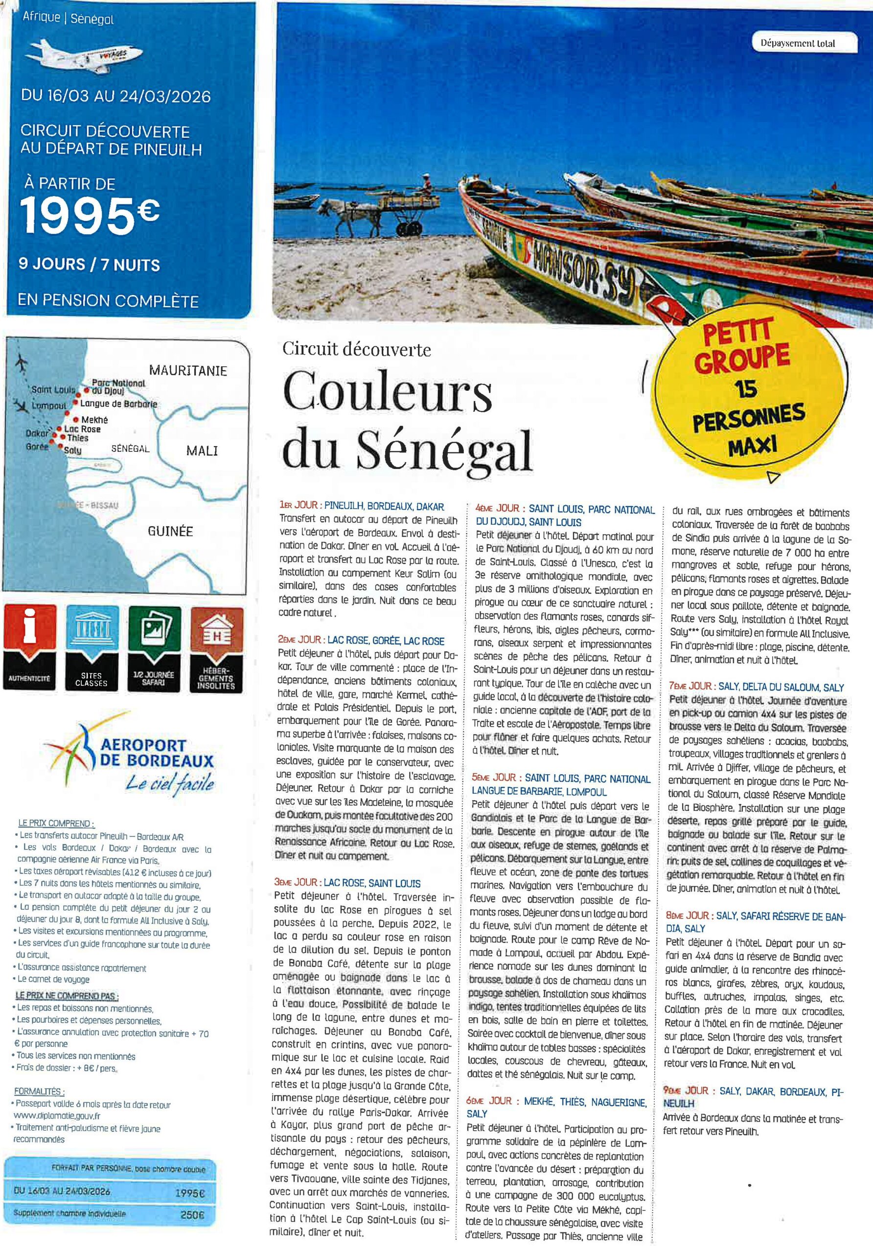 2159€/2174€. Règlement 500€ à l’inscription. Départ vol direct de Bordeaux. 10 Jours.