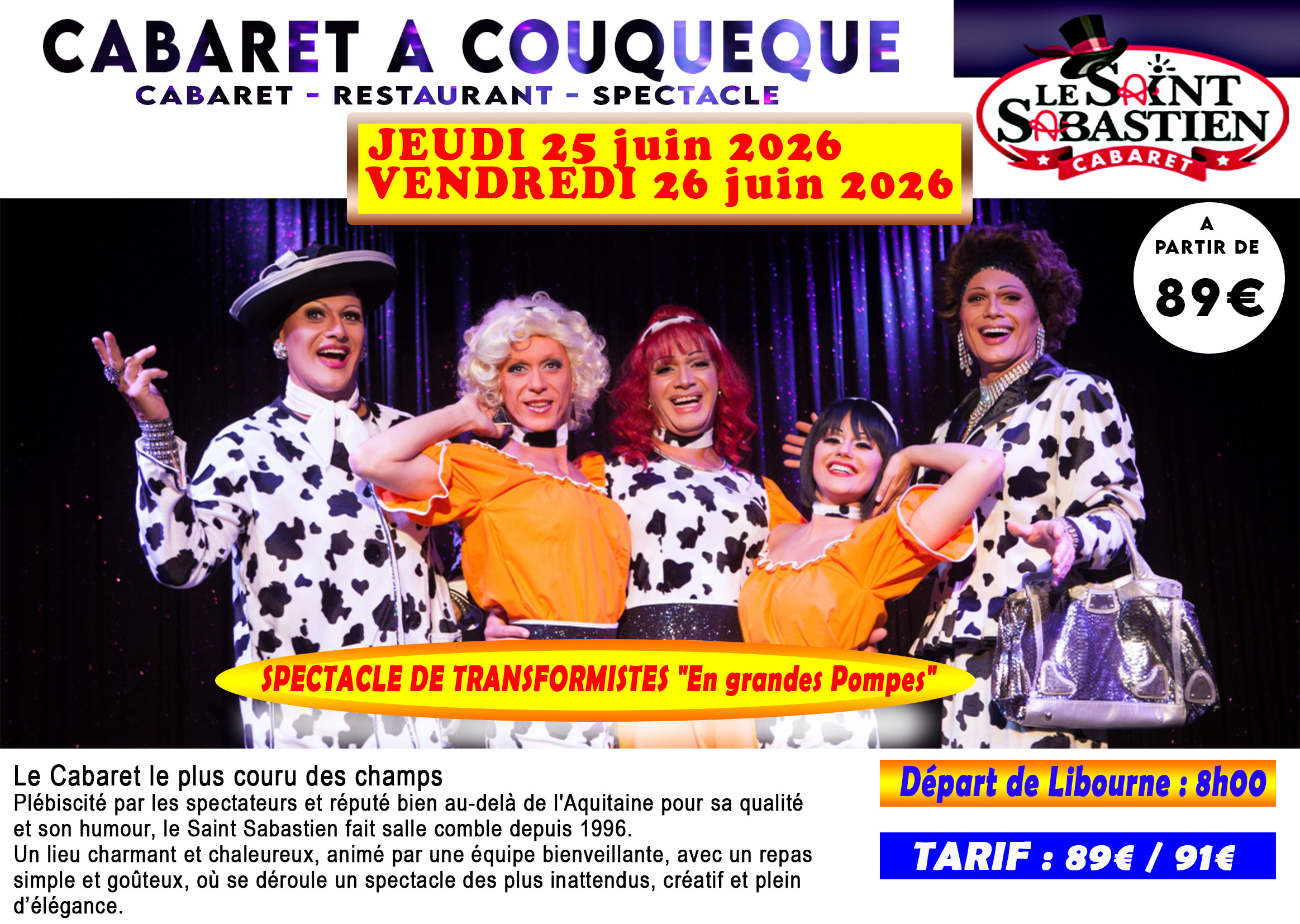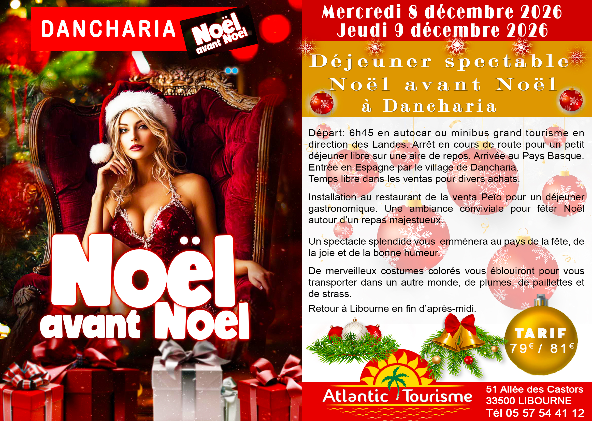 79€/81€. Départ 6h45. Transport et repas spectacle inclus. Temps libre Shopping.