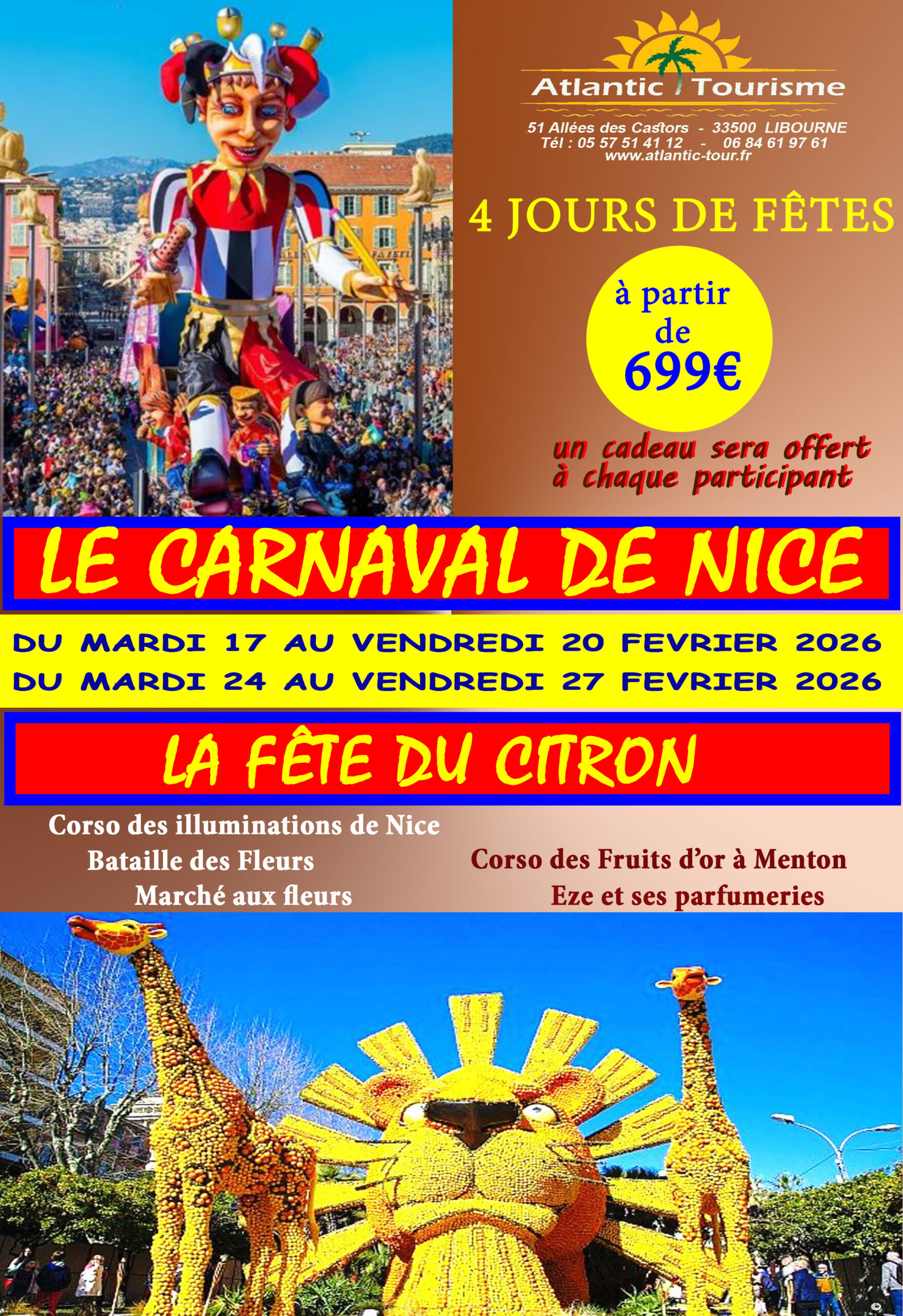 699€/714€. Départ : 5h15. Règlement 200€ à l’inscription. Marché aux fleurs, fête des citrons à Menton