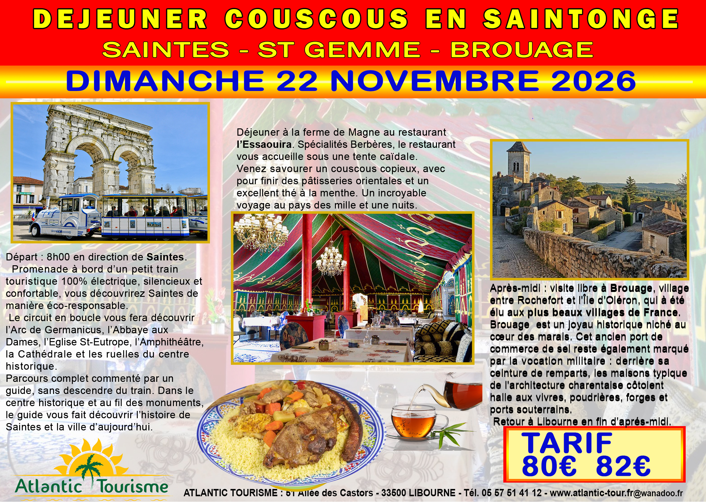 80€/82€. Départ 8h. Visite de SAINTES, Déjeuner au restaurant l’ESSAOUIRA, Temps libre à BROUAGE.