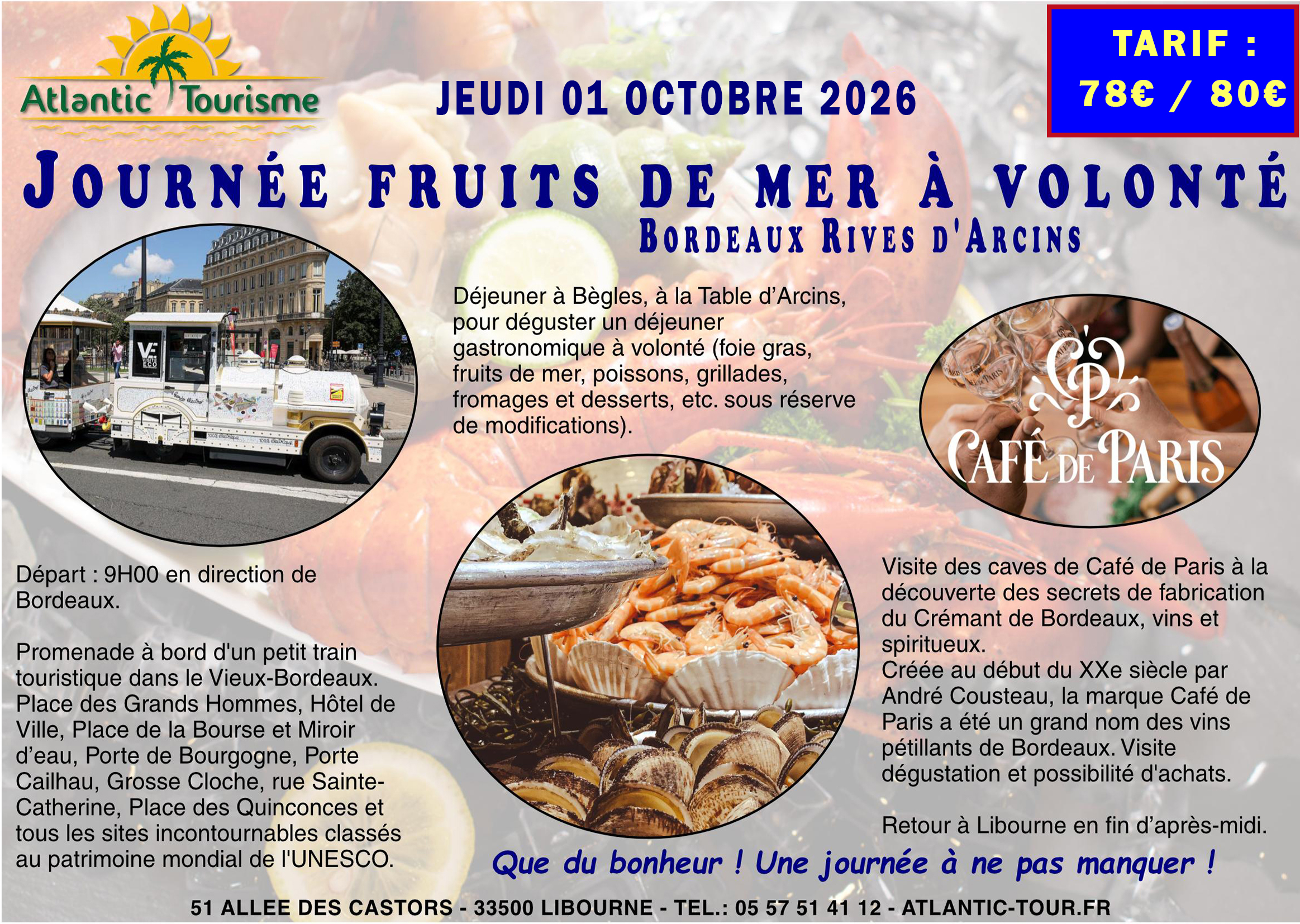 78€/80€. Départ : 9h. Déjeuner à VOLONTE (FRUIT DE MER ET GRILLADES) à Rives d’Arcins