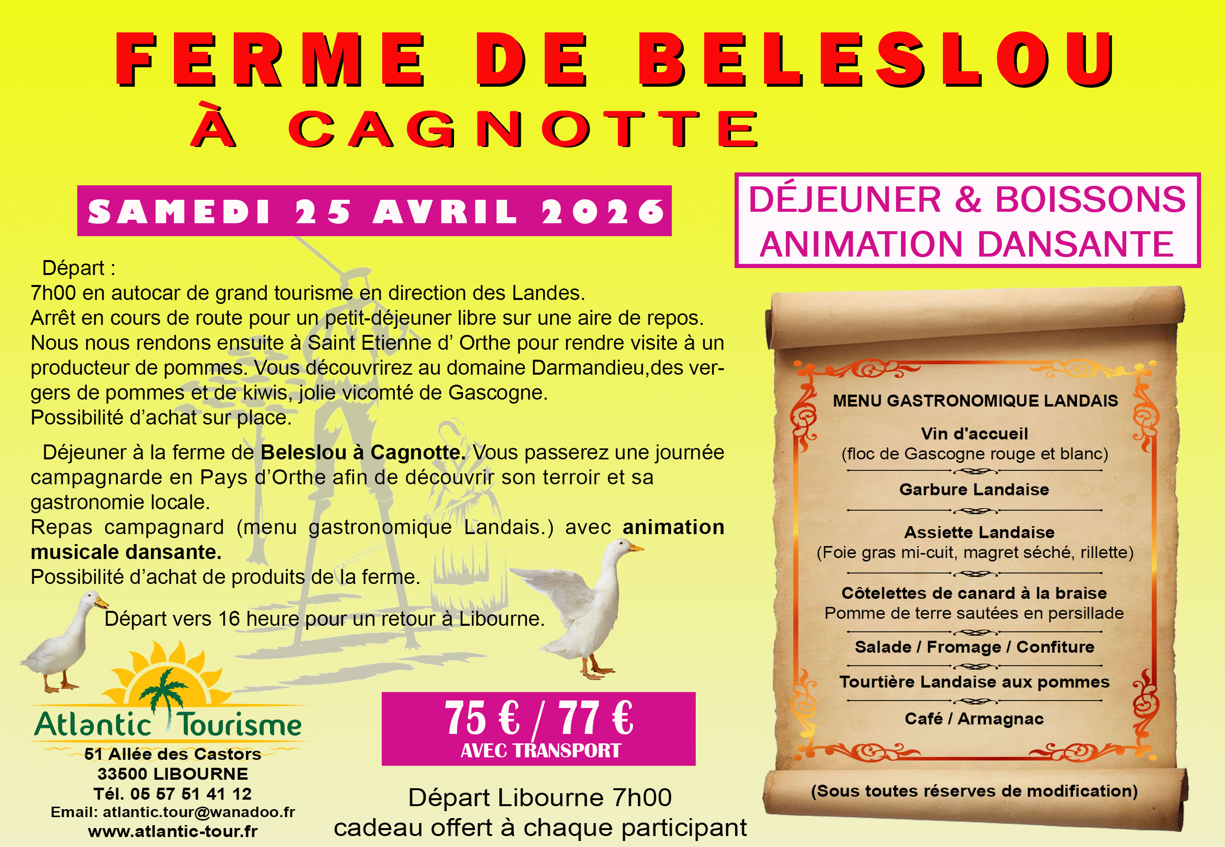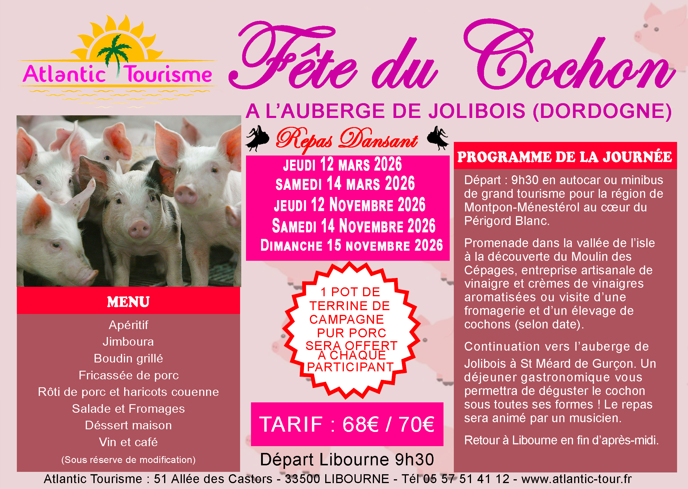 68€/70€. Départ : 7h45. Un cadeau sera offert à chaque mamies !!!