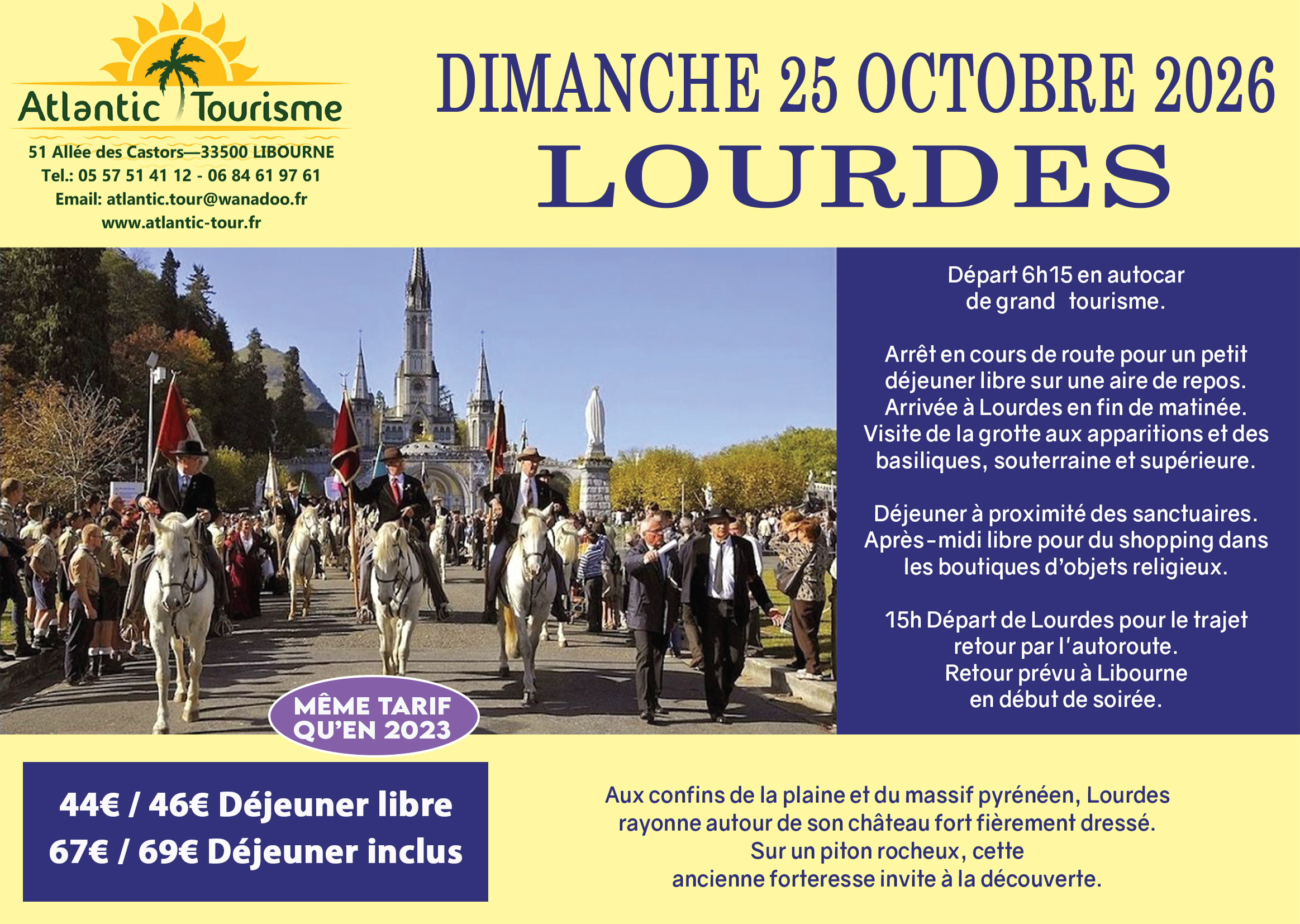 67€/69€ (transport et déjeuner) ou 44€/46€ (Transport seul). Départ 6h15.