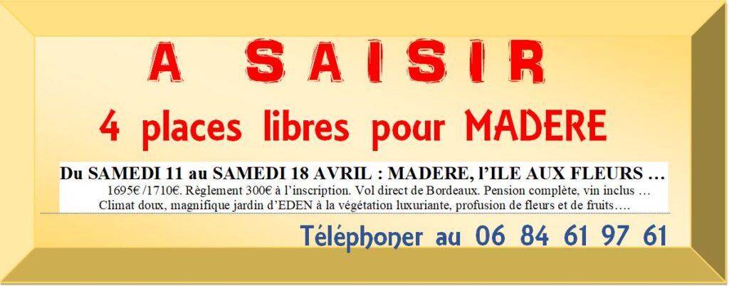 94€/96€. Départ : 18h. Règlement à l’inscription. Places limitées … « LE RETOUR »