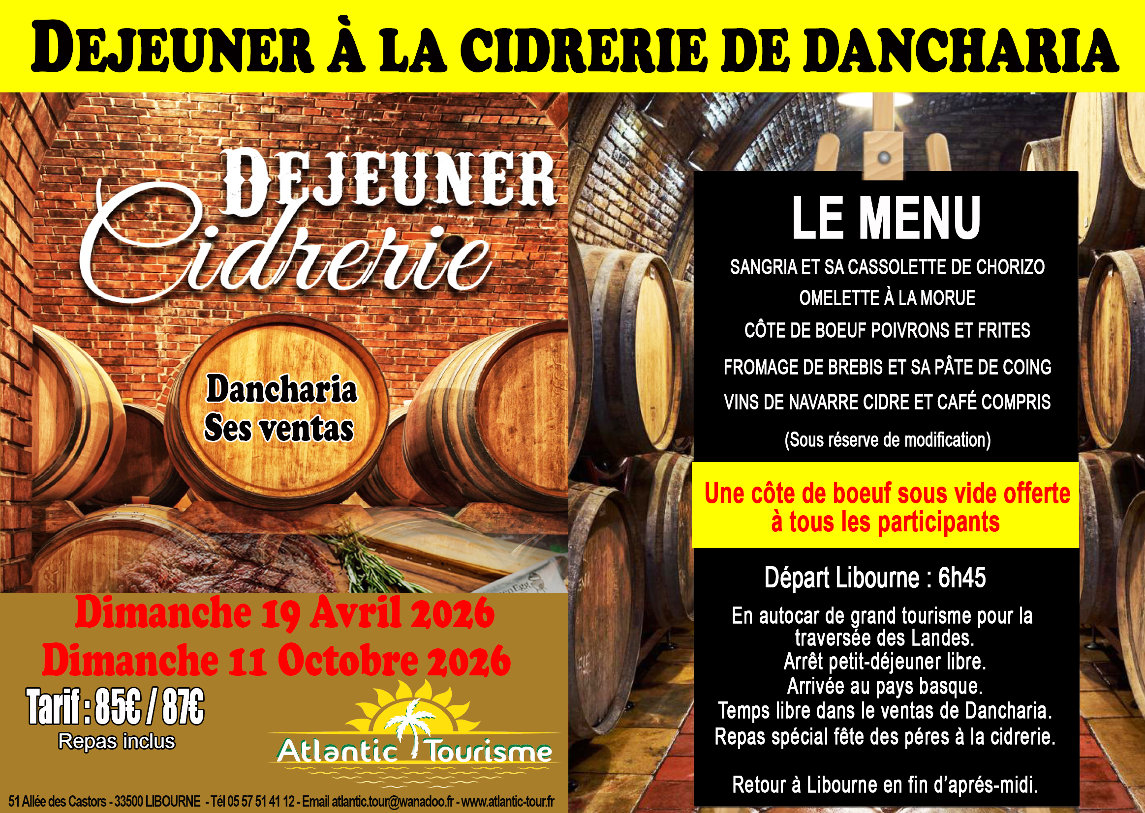 55€/57€ (transport et déjeuner) ou 37€/39€ (Transport seul). Départ : 6h45 pour le Pays basque.