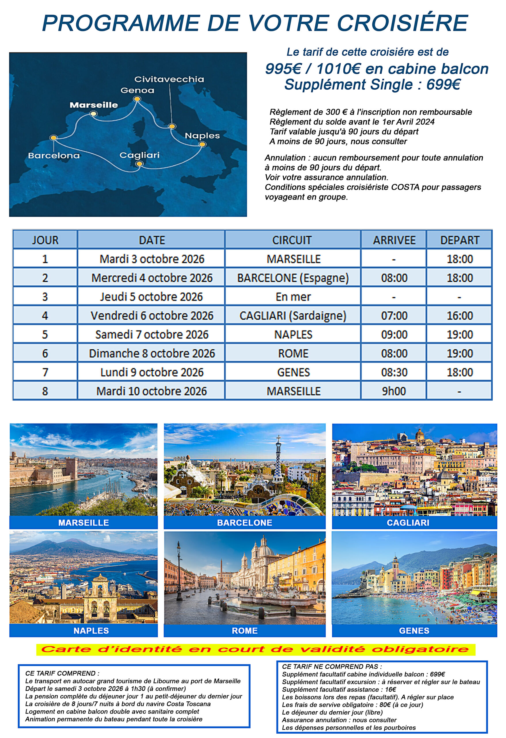 Du SAMEDI 3 au SAMEDI 10 OCT : CROISIERE COSTA en MEDITERRANEE