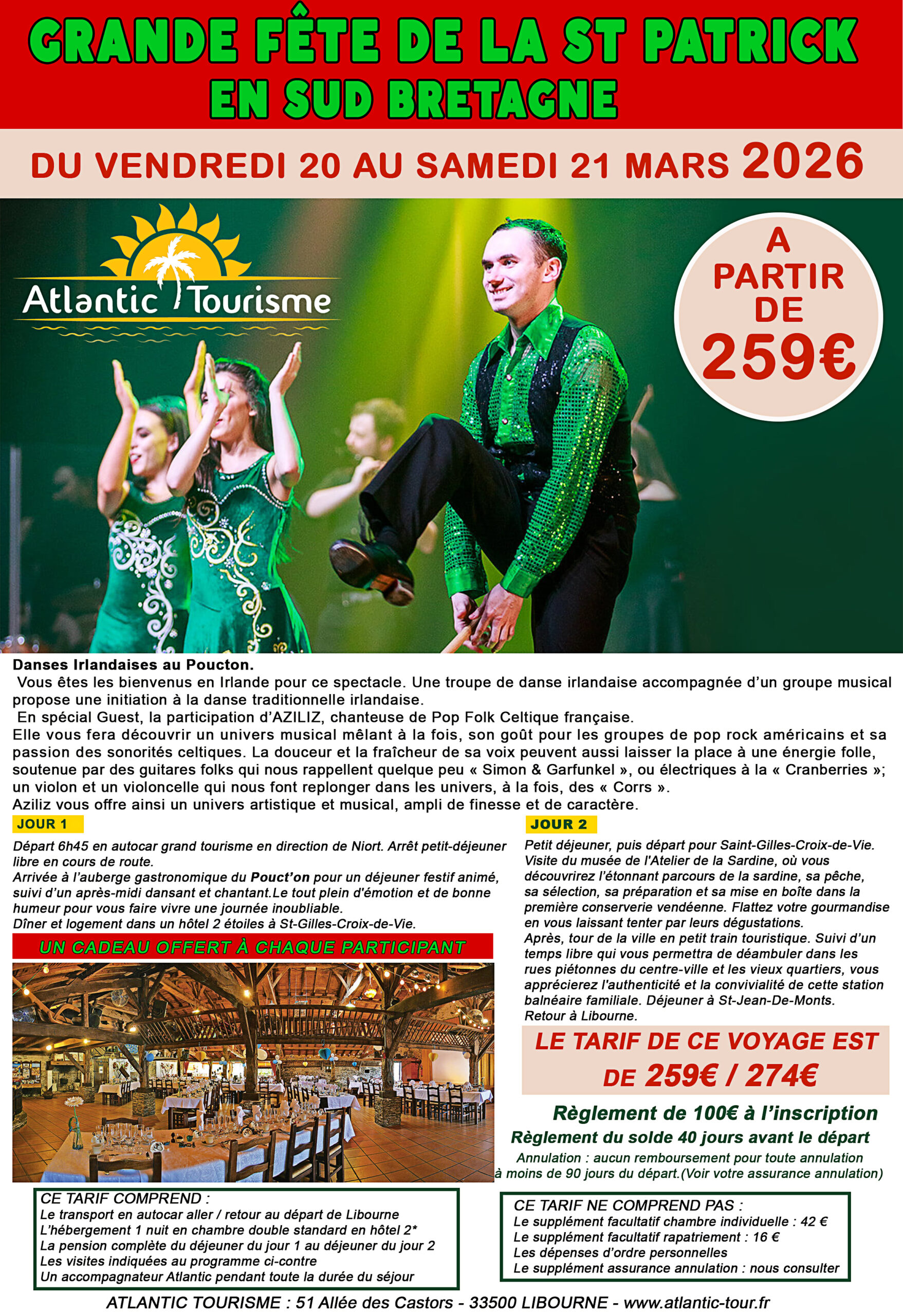 259€/264€. Départ :6h45. Règlement 100€ à l’inscription. Weekend en pays celte….