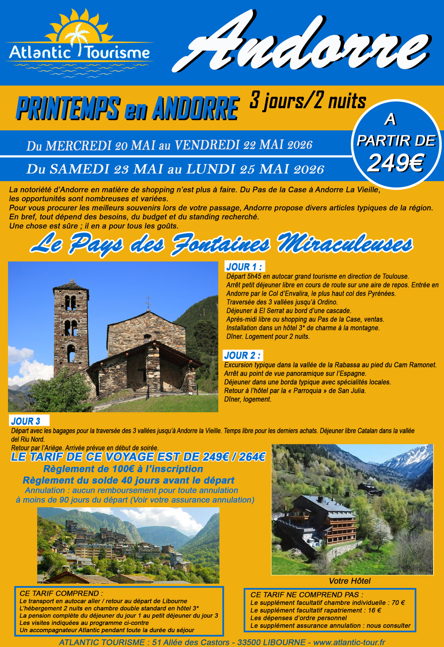 489€/504€. Départ : 7h45. Règlement 200€ à l’inscription. Toutes les chambres sont avec un grand lit.