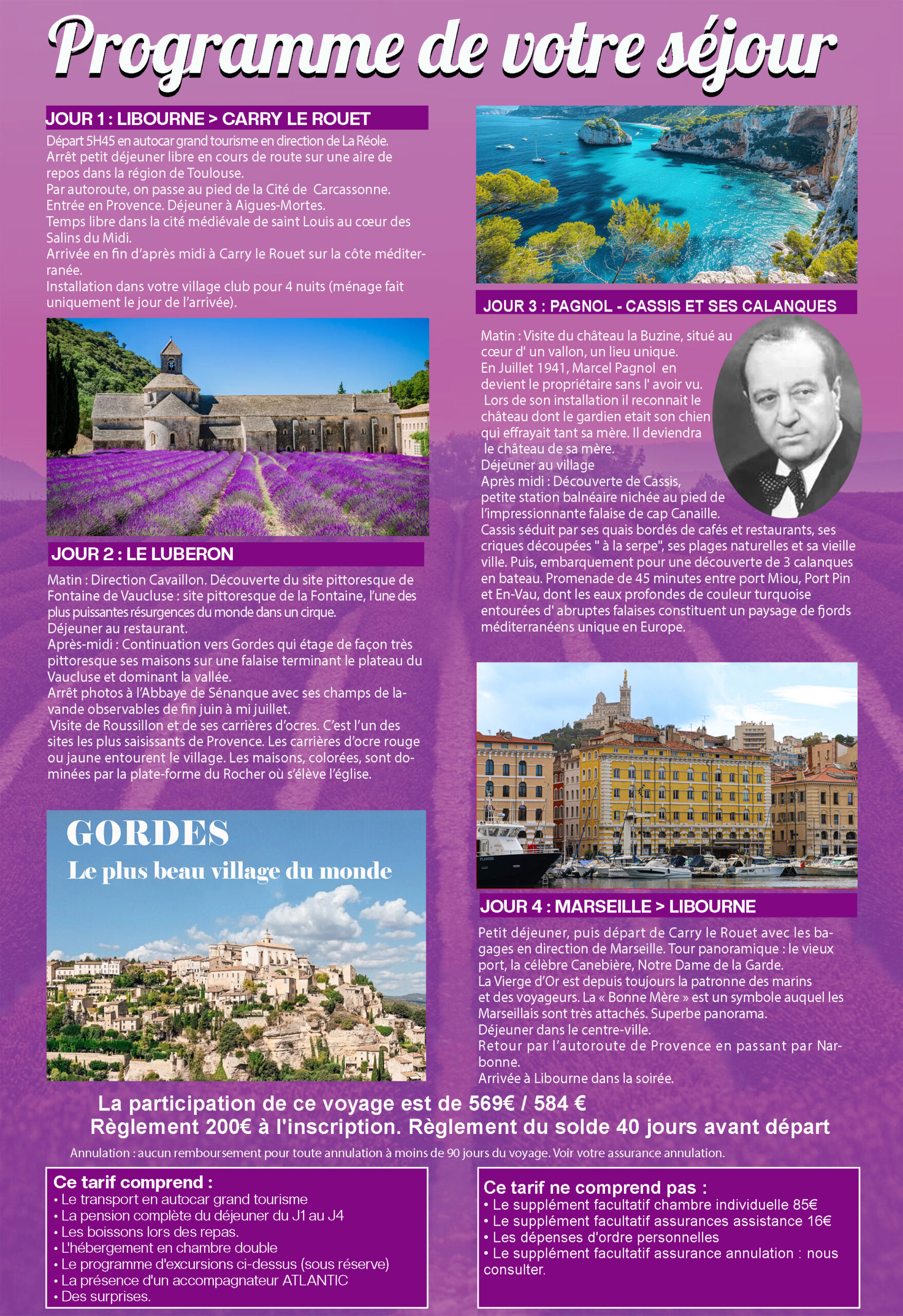 Départ 1h30 pour MARSEILLE. Règlement 300€ à l’inscription.