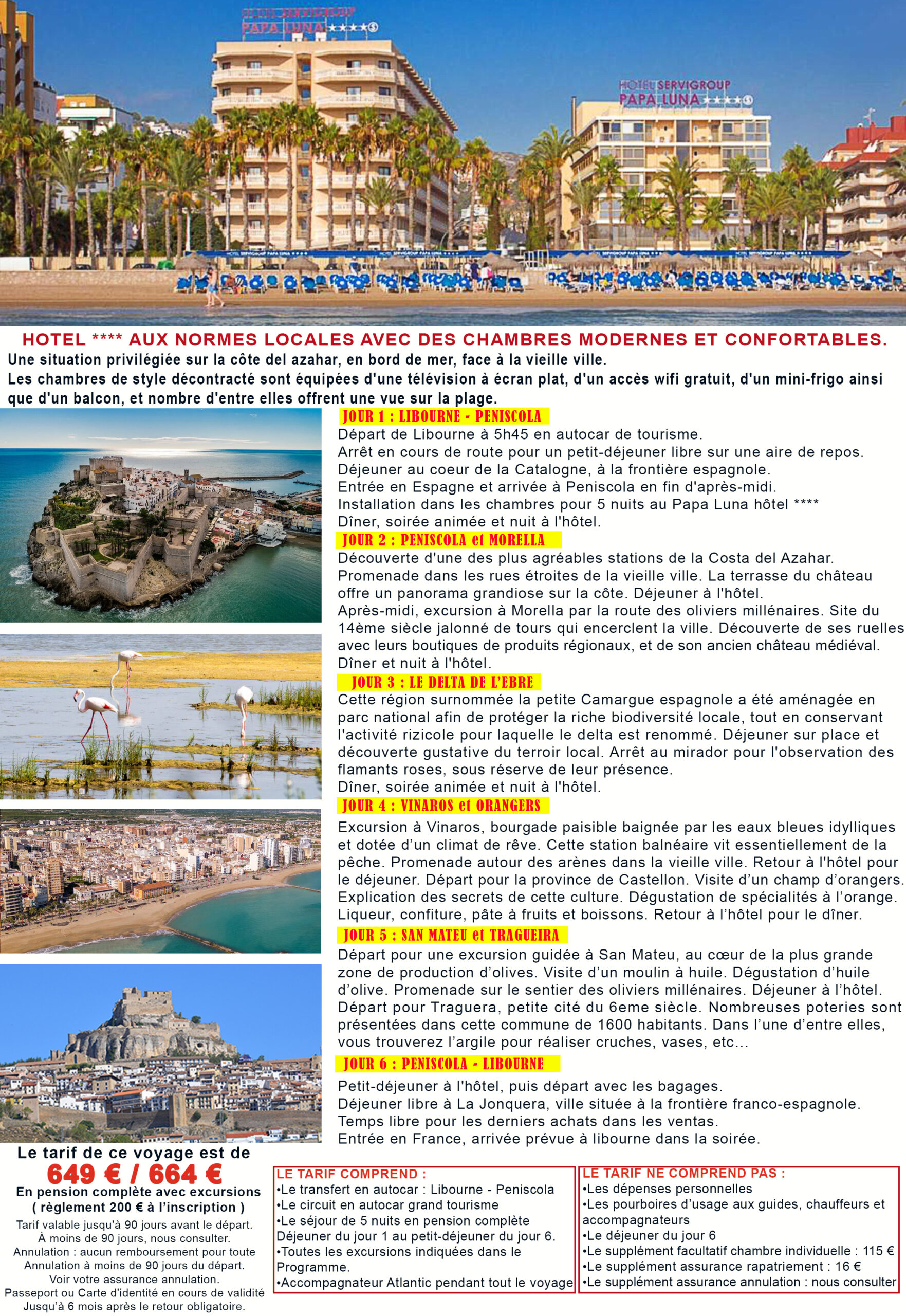 369€/384€. Départ : 5h45. Règlement 100€ à l’inscription. Logement à Calafell 3 nuits en hôtel 3*.