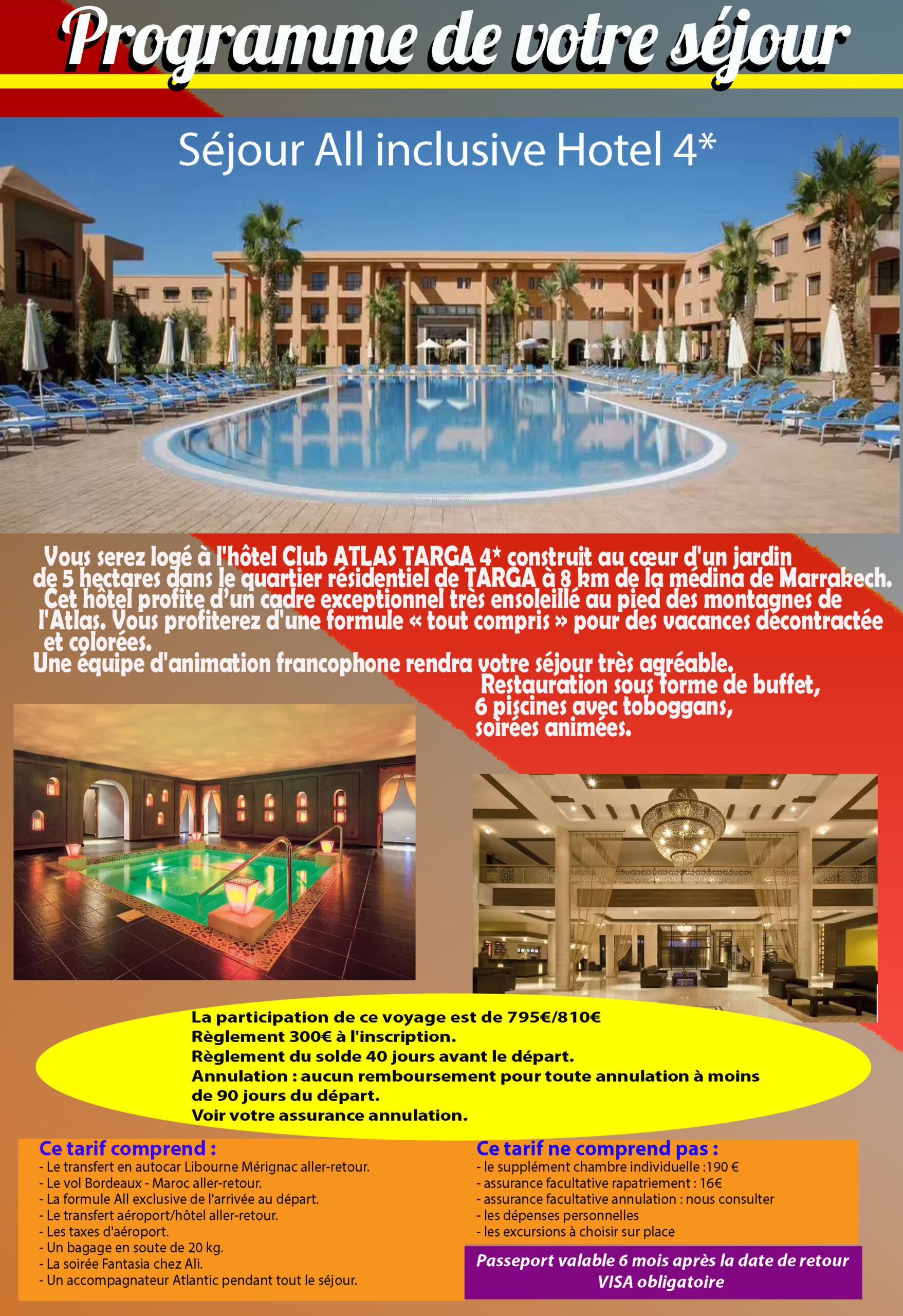 Hôtel 4 étoiles avec animation dansante tous les soirs. Règlement 200 € à l’inscription.
