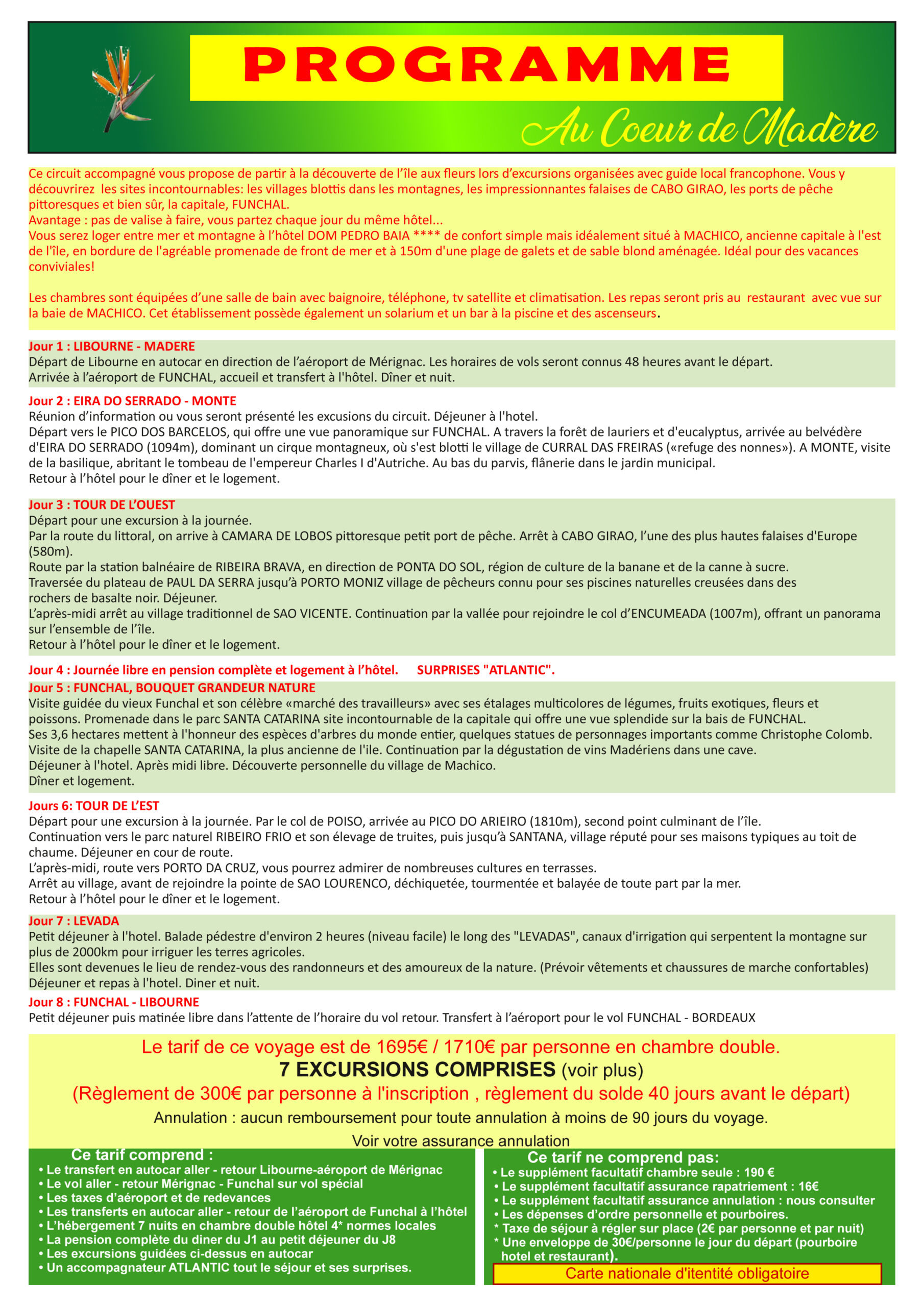 469€/474€. Départ : 5h45. Règlement 200€ à l’inscription. PLACES LIMITEES