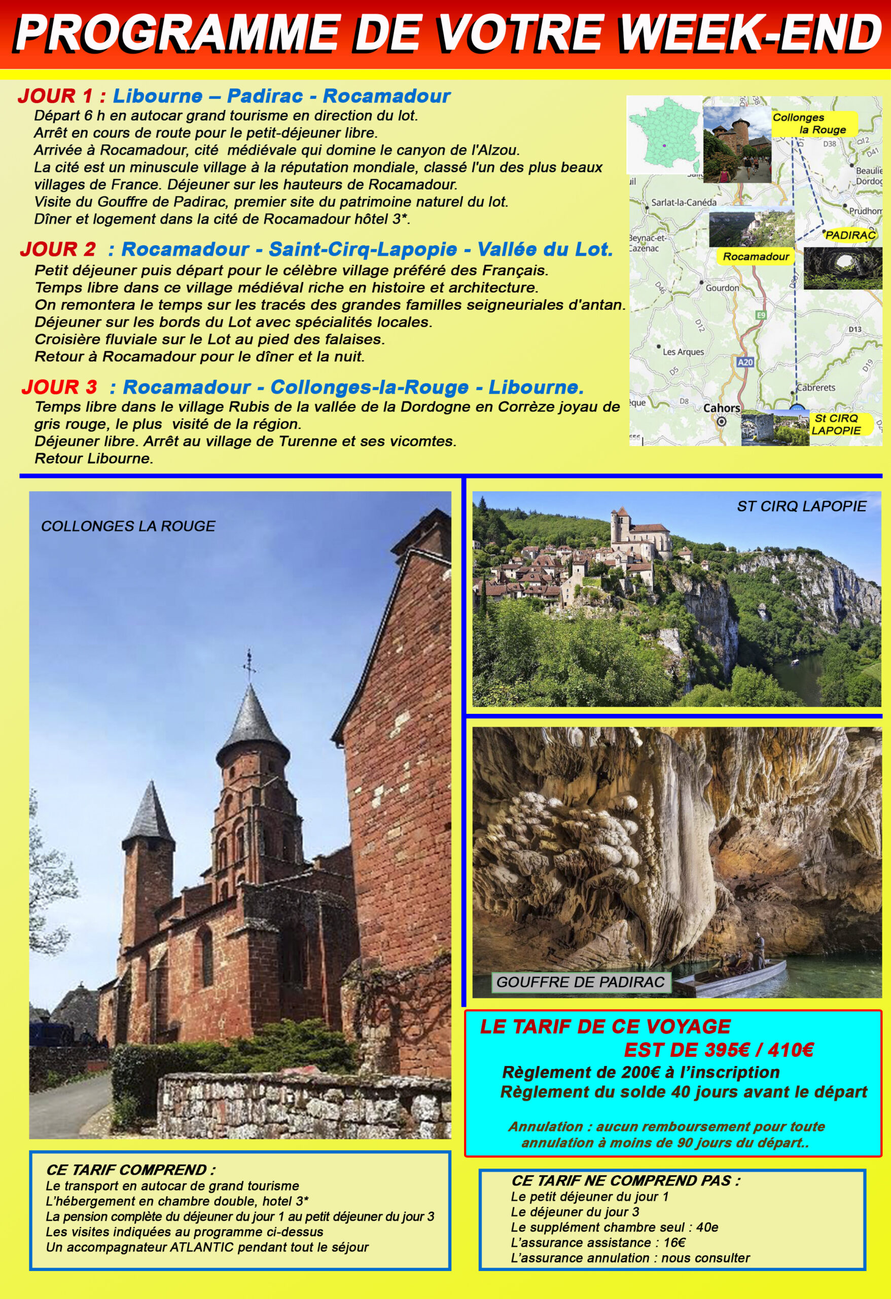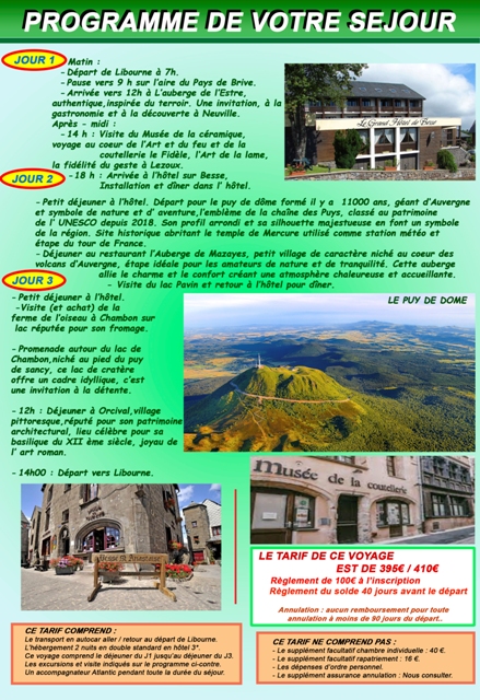 395€/ 410€ ; Départ : 6h30. Règlement 100€ à l’inscription. Circuit des merveilles du Causse…..