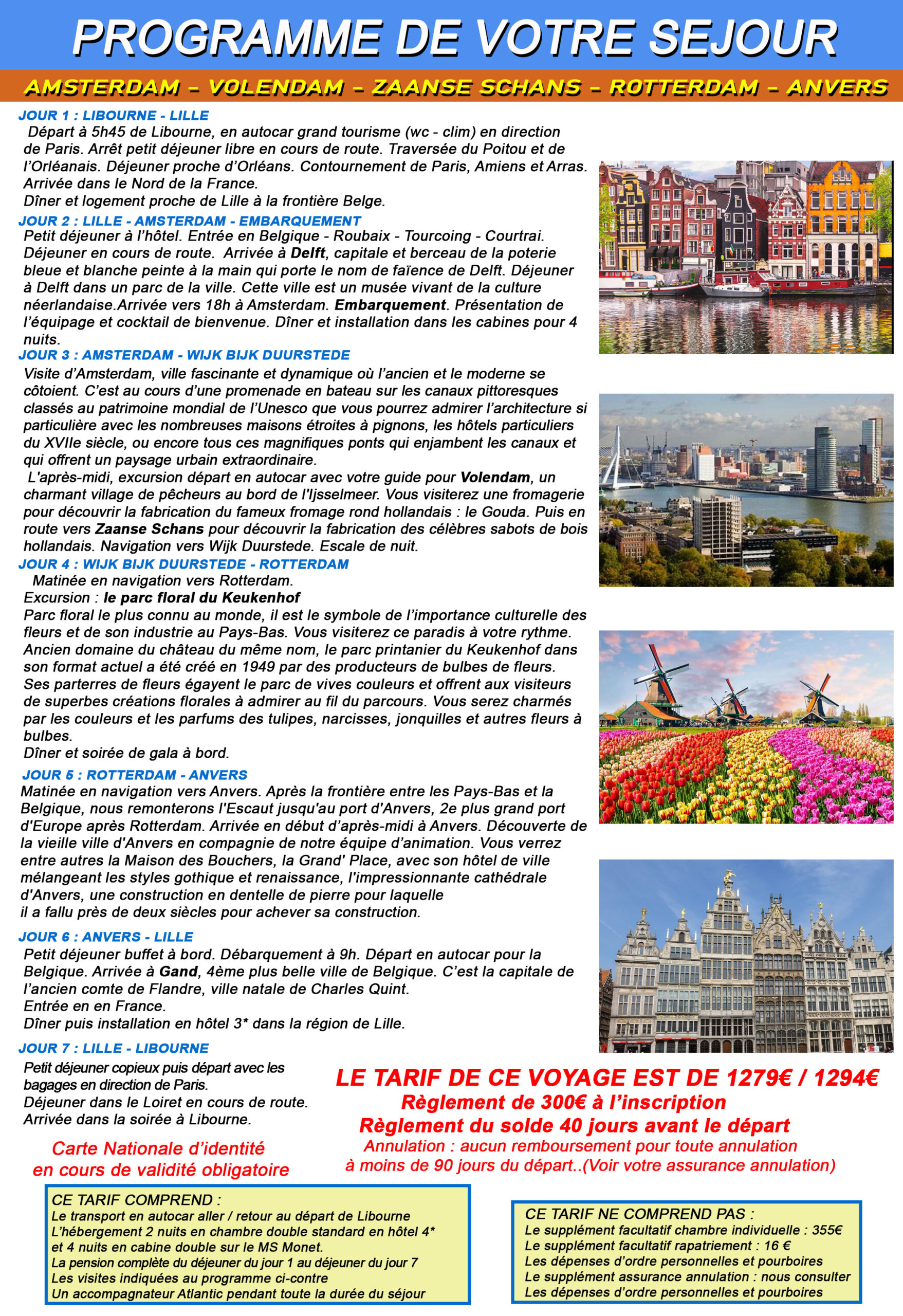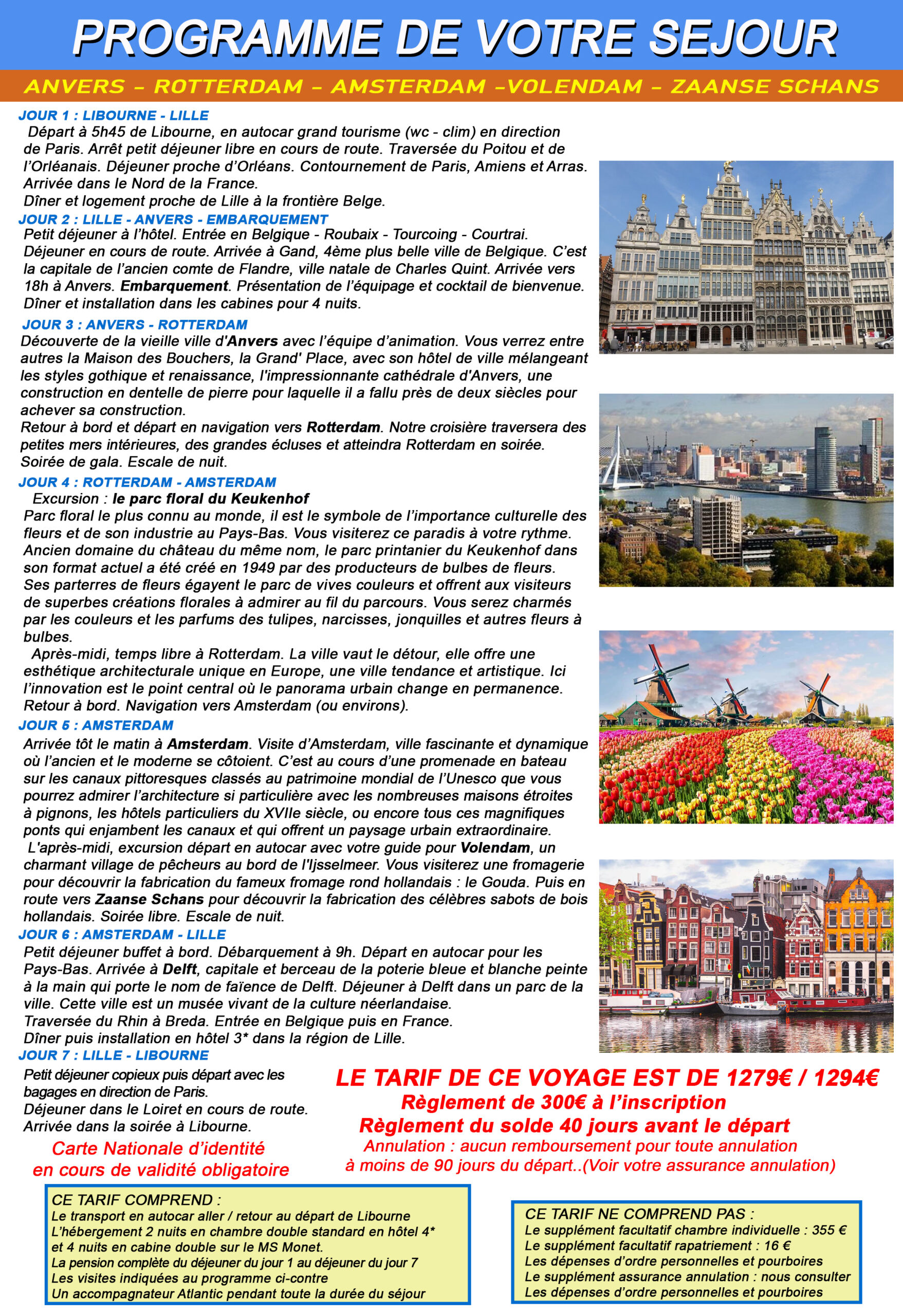 1279€/ 1294€. Départ : 5h45. Règlement 300€ à l’inscription. La BELGIQUE et ANVERS.