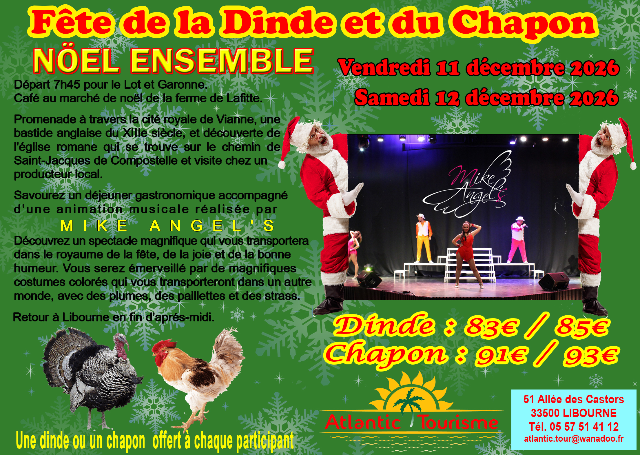 83€/85€ (Dinde offerte) ou 91€/93€ (Chapon offert) Départ : 7h45 pour Vianne dans le Lot et Garonne.