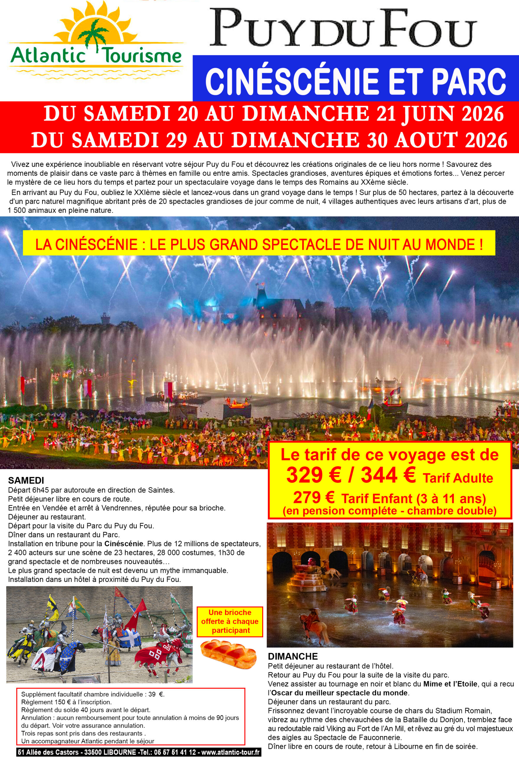Du SAMEDI 29 au DIMANCHE 30 AOUT : LE PUY DU FOU : Cinéscénie Parc