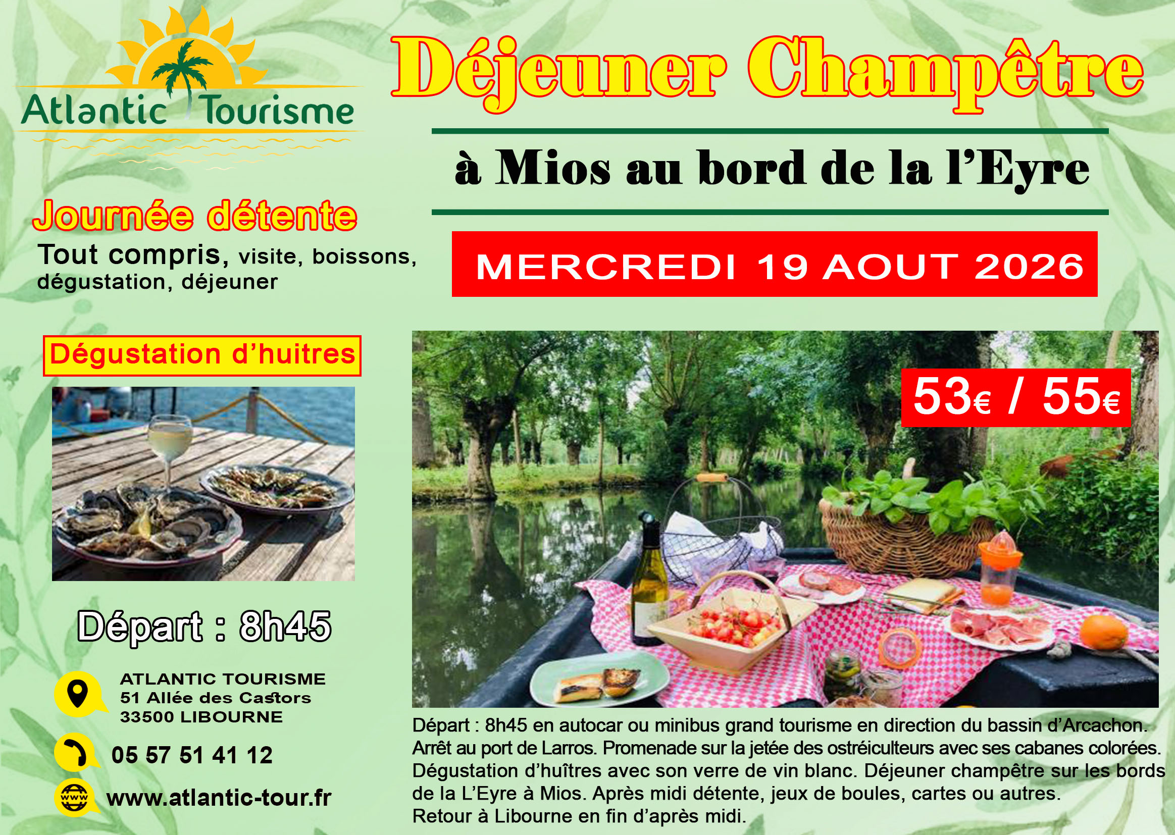 64€/66€. Départ : 8h30. Dégustation d’huitres à volonté sur le port de Larros bassin d’Arcachon.