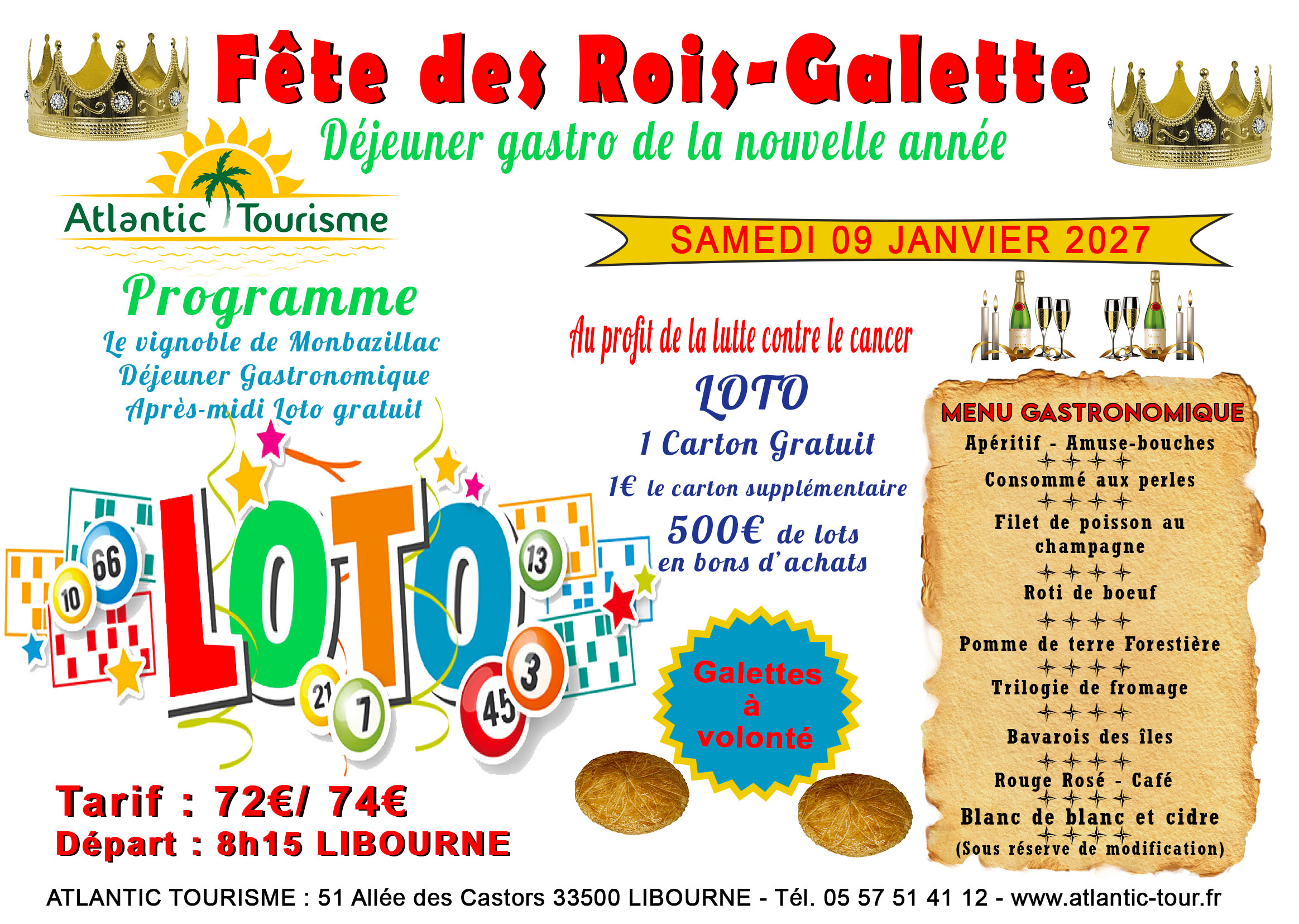 72€/74€. Départ : 9h. Après midi – LOTO gratuit (premier carton gratuit, le second à 1€ pour le cancer)